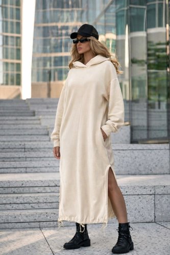 Asimetrik kesim kapşonlu iki iplik kumaş elbise