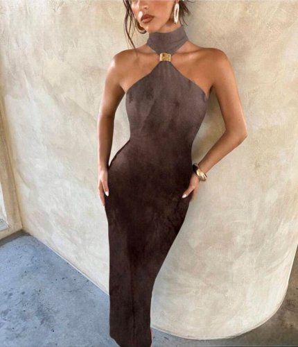 Boyundan bağlamalı toka detaylı dalgıç kumaş elbise