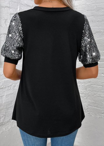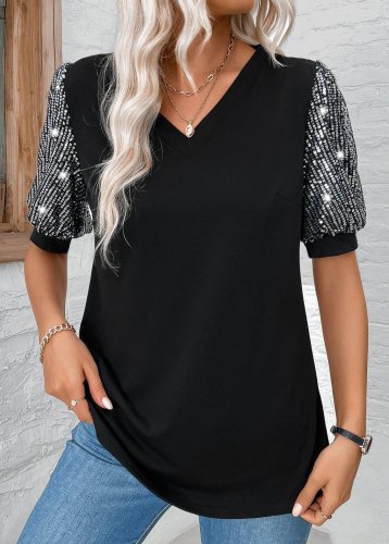 • Kadın kısa kollu v yakalı pul payet detaylı viskon bluz