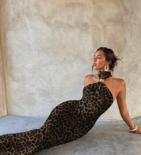 Boyundan bağlamalı toka detaylı dalgıç kumaş elbise